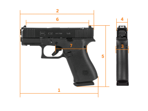GLOCK 43X Rail FS- slimline model v kategórii subcompact s čiernym záverom, je štíhla pištoľ s vysokou kapacitou. G43X Rail má rovnakú kompaktnú dĺžku a veľkosť úchopu s minimálnym profilom a vstavaným bobrím chvostom ako G48.Kombinuje krátke a štíhle rozmery s veľkosťou rámu modelu G48. Perfektne vyvážená, štíhla, fit, pre takmer všetky veľkosti rúk, s uspokojivou kapacitou zásobníka a vysokou palebnou schopnosťou. 10-ranový jednoradový zásobník Slim 01 má špecifický dizajn, ktorý znižuje jeho rozmery na minimum. Oranžový podávač umožňuje strelecovi jasne zistiť, či v zásobníku zostali nejaké náboje alebo nie. Kovová vložka je pokrytá polymérovým povlakom rovnako ako u všetkých zásobníkoch GLOCK.